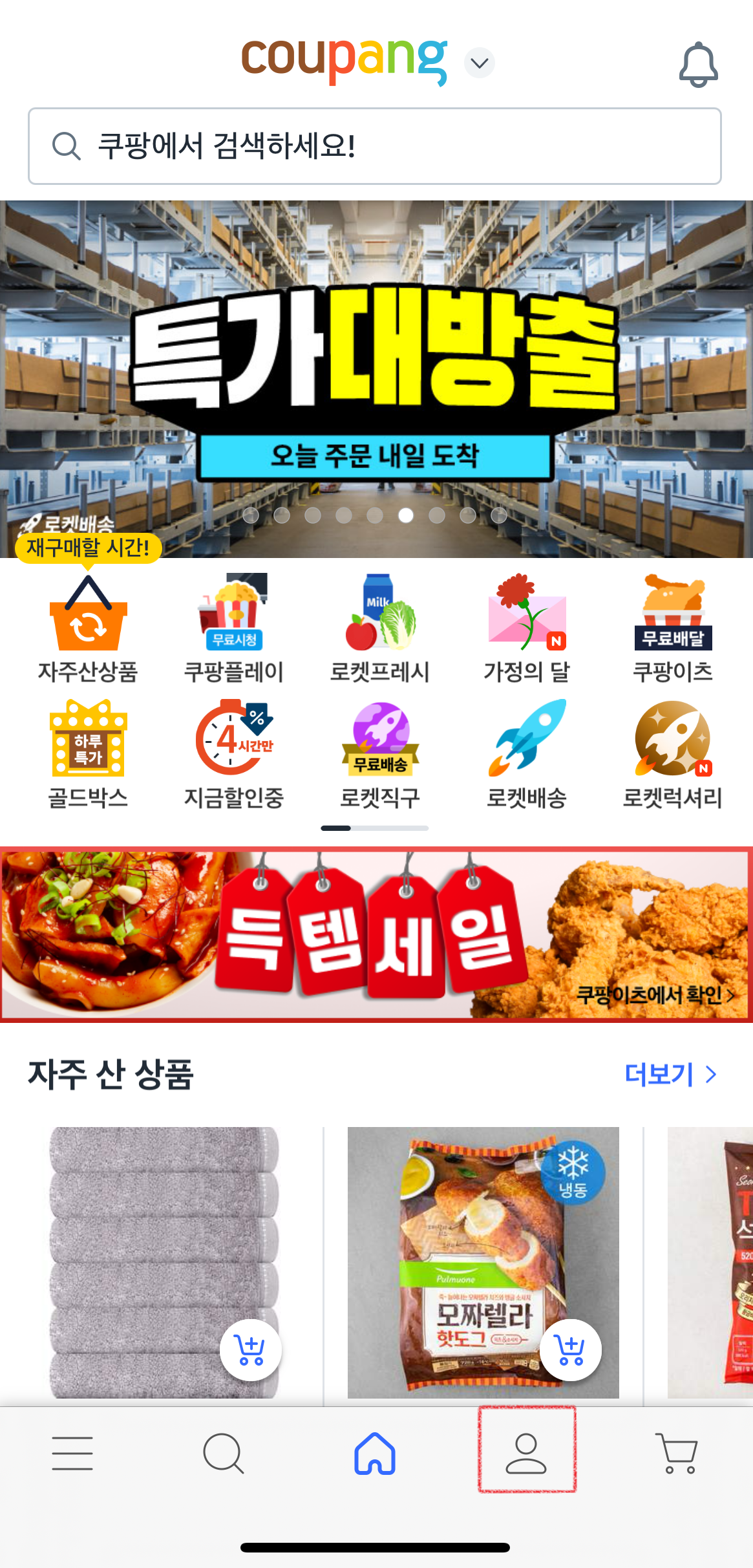 먼저 쿠팡 어플에 접속한 뒤 아래에 있는 사람모양의 아이콘을 클릭해 줍니다.